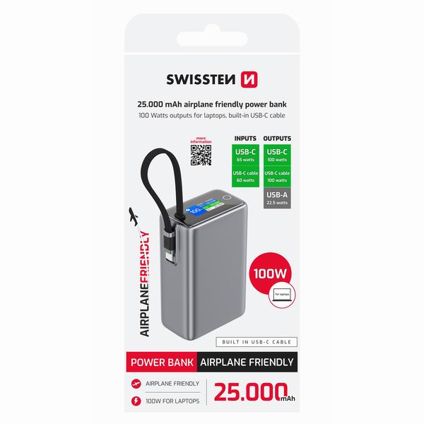 SWISSTEN, Power Bank, Li-Pol, 5/9/12V, mobile phones´, etc. charging, 22013977, 25000mAh, USB-C + USB-A, 100W, black