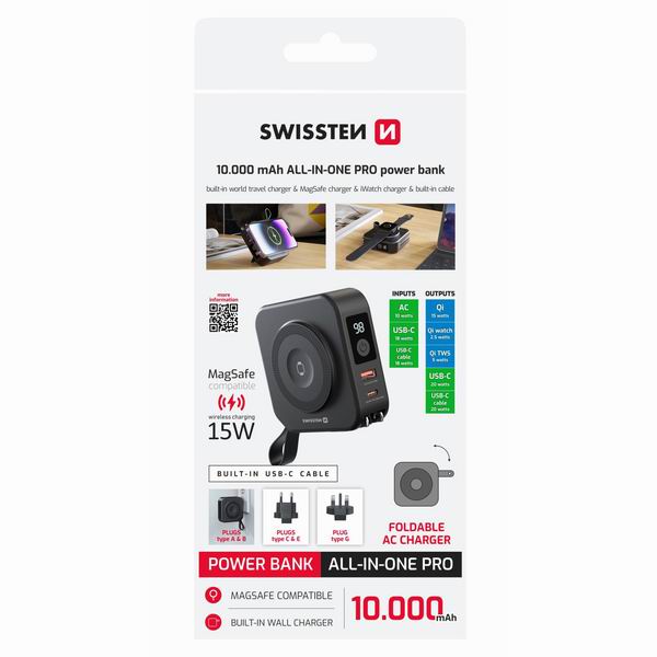 SWISSTEN, Power Bank, ALL-IN-ONE PRO, Li-Pol, 5/9/12V, mobile phones´, etc. charging, 22013978, 10000mAh, USB-C kabel, 15W, black
